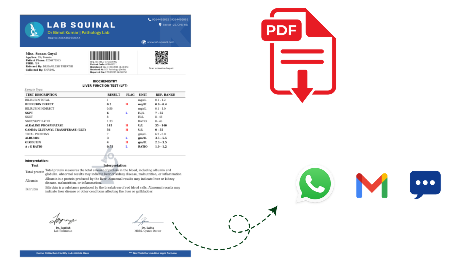Generate in PDF format.Share via WhatsApp, Email, or Download.QR code on printed reports links to digital version.